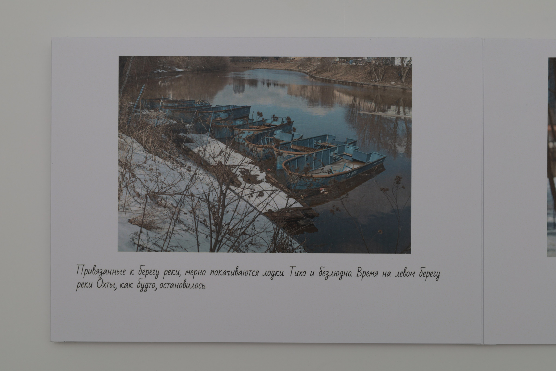Привязанные к берегу реки, мерно покачиваются лодки. Тихо и безлюдно. Время на левом берегу реки Охты, как будто, остановилось.